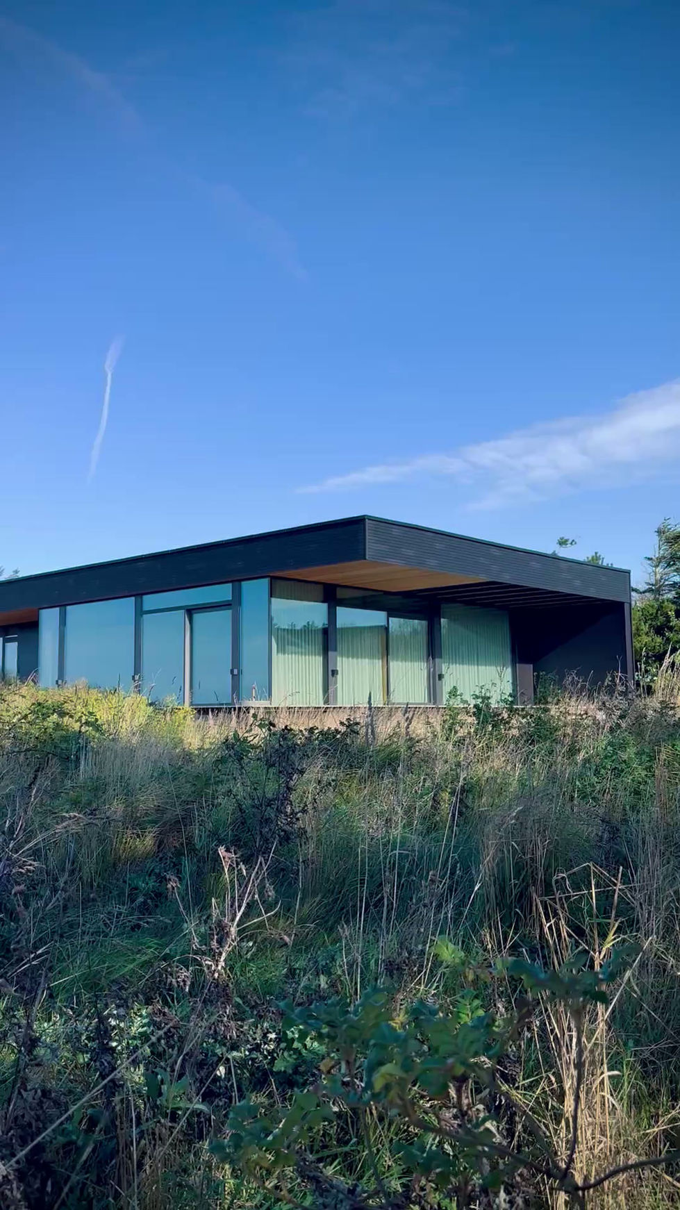 Sommerhus i første rekke mot Limfjorden, Danmark. Landskapets åpne horisont avspeiles i husets linjer.